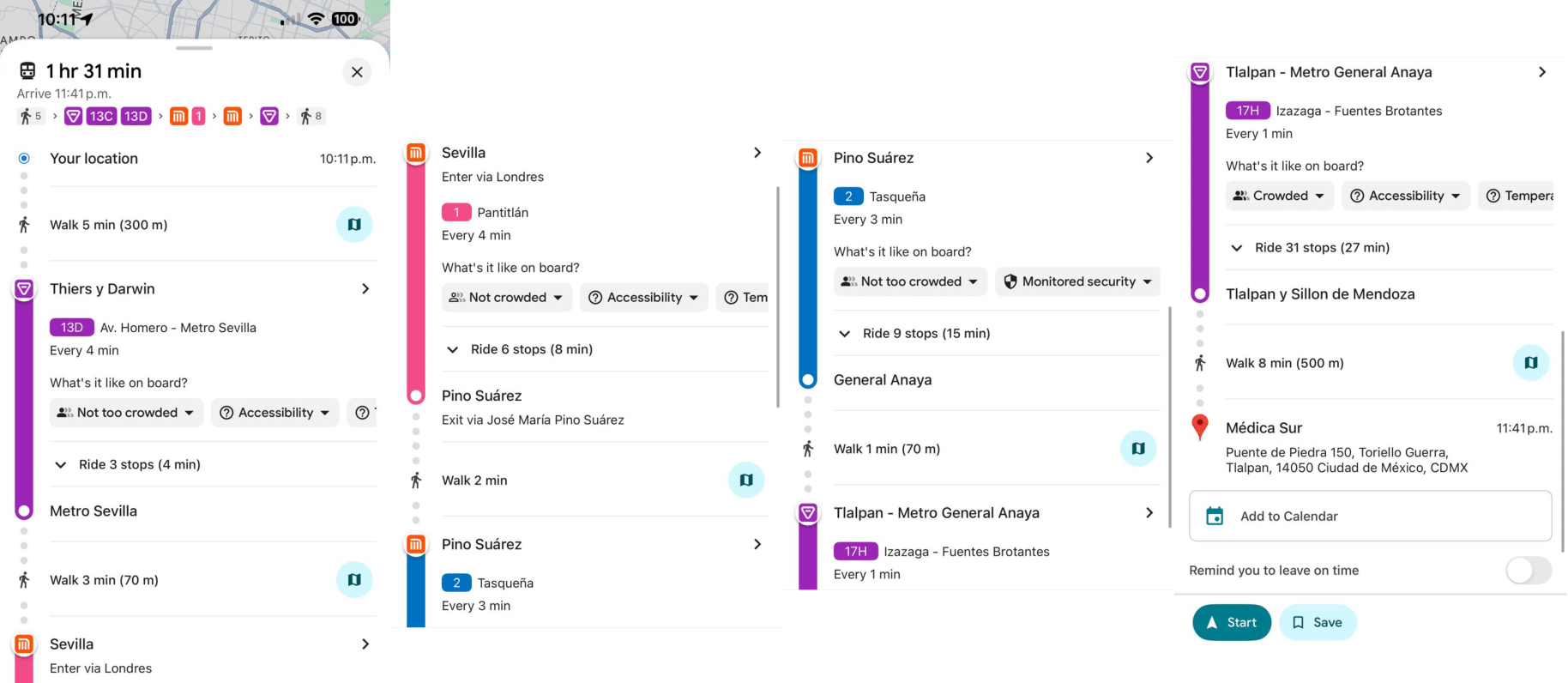 Me metí a la app de Google Maps e hice una ruta de cerca de Reforma hacia Médica Sur, y le tomé screenshots para que se pueda ver toda la ruta; entonces queda de la siguiente manera: